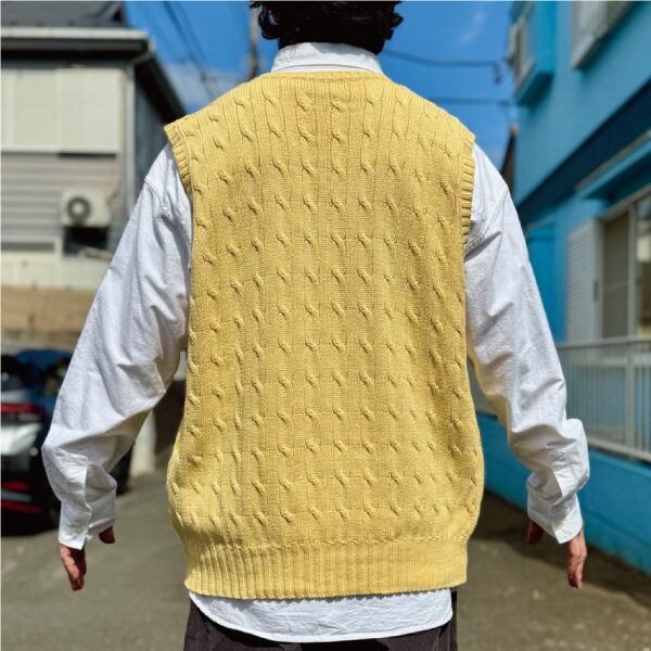 「Polo by Ralph Lauren (ポロラルフローレン)」90s 00s 10s XLサイズ コットン イエロー ゴルフ刺繍 ケーブル編み ニット ベスト [2516011]