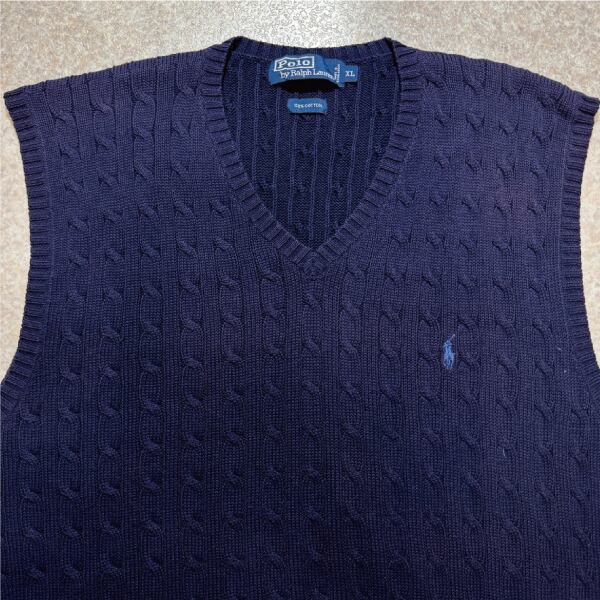 「Polo by Ralph Lauren (ポロラルフローレン)」90s 00s 10s XLサイズ コットン ネイビー ポニー刺繍 ケーブル編み ニット ベスト [2516015] | 古着屋IDENTITY