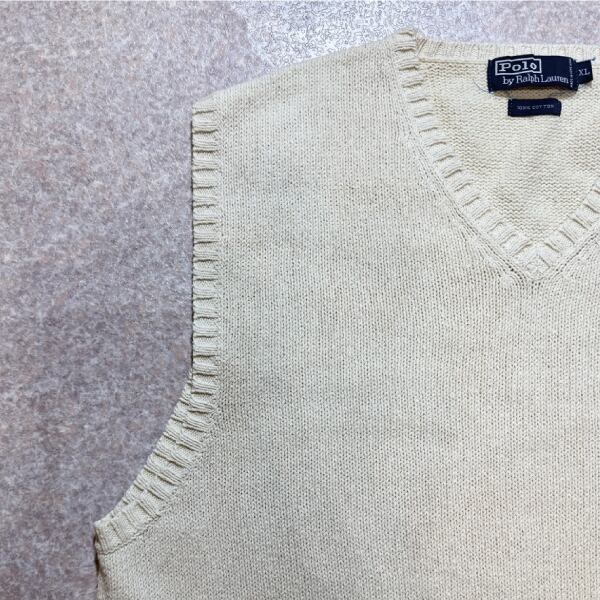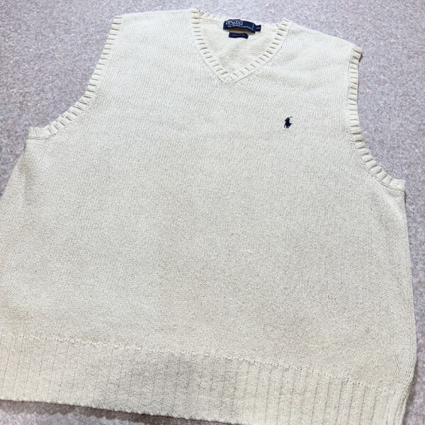 「Polo by Ralph Lauren (ポロラルフローレン)」90s 00s 10s XLサイズ コットン オフホワイト ポニー刺繍 ローゲージ ニット ベスト [2516018] | 古着屋IDENTITY