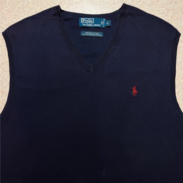 「Polo by Ralph Lauren (ポロラルフローレン)」90s 00s 10s Lサイズ ピマコットン ネイビー ポニー刺繍 ニット ベスト [2516036] | 古着屋IDENTITY
