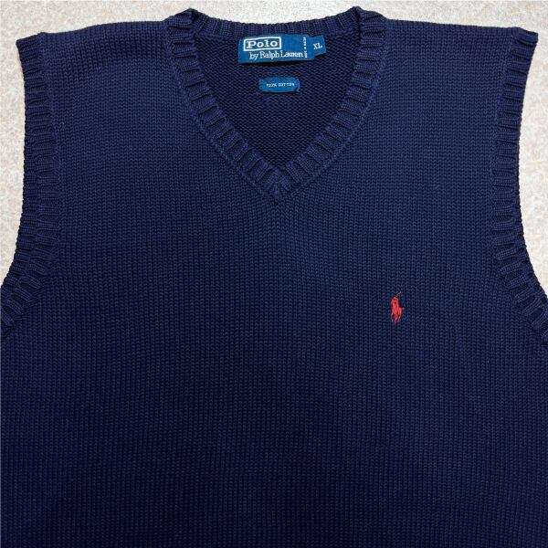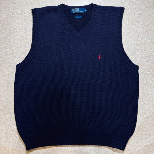 「Polo by Ralph Lauren (ポロラルフローレン)」90s 00s 10s XLサイズ コットン ネイビー ポニー刺繍 ローゲージ ニット ベスト [2516037] | 古着屋IDENTITY