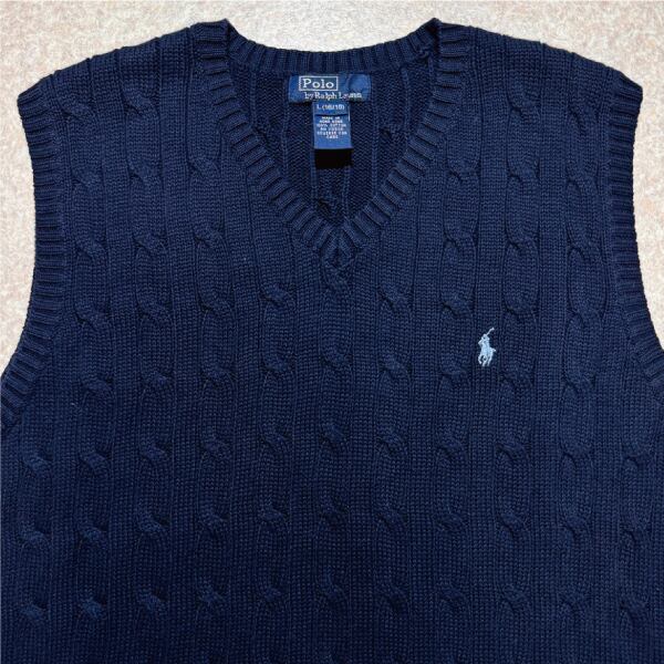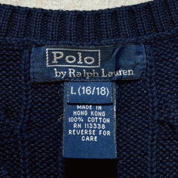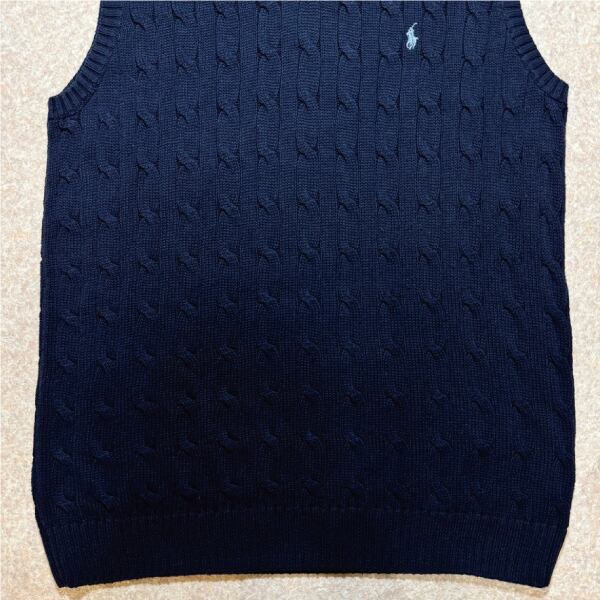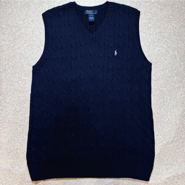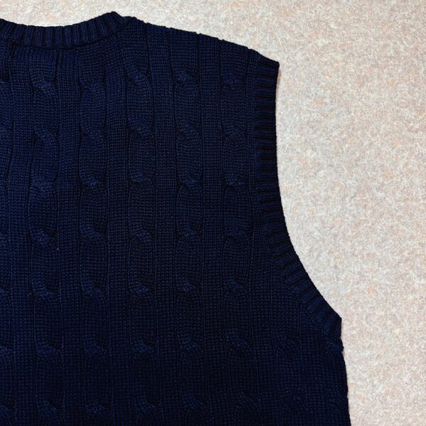 「Polo by Ralph Lauren (ポロラルフローレン)」90s 00s 10s ボーイズ L(16/18) Mサイズ相当 コットン ネイビー ケーブル編み ポニー刺繍 ニット ベスト [2516050]