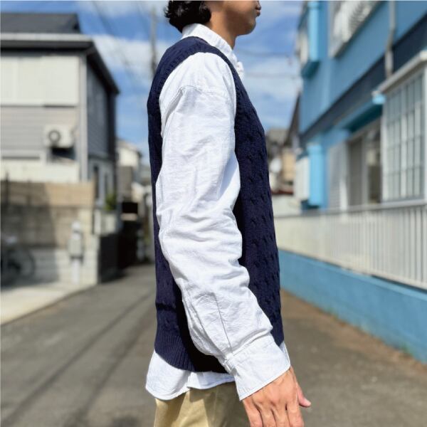 ニットベストに相性抜群な襟付きシャツはもちろん、カットソーを合わせていただいても、様になる着こなしをお楽しみいただけます!