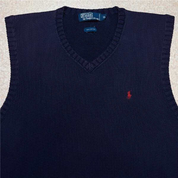 「Polo by Ralph Lauren (ポロラルフローレン)」90s 00s 10s XLサイズ コットン ネイビー ポニー刺繍 ローゲージ ニット ベスト [2516062] | 古着屋IDENTITY