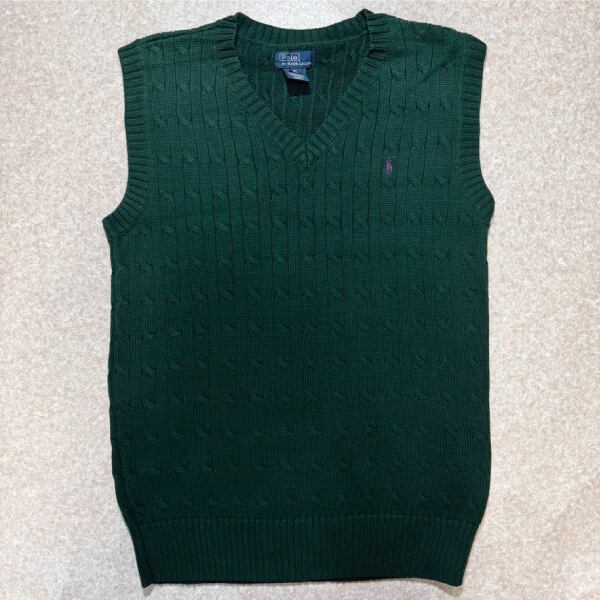 「Polo by Ralph Lauren (ポロラルフローレン)」90s 00s 10s ボーイズ XL Sサイズ相当 コットン グリーン ケーブル編み ポニー刺繍 ニット ベスト [2516077]