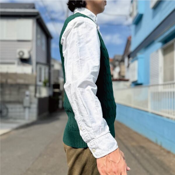 ニットベストに相性抜群な襟付きシャツはもちろん、カットソーを合わせていただいても、様になる着こなしをお楽しみいただけます!