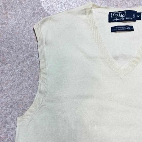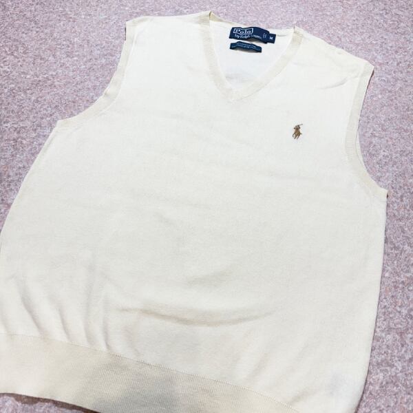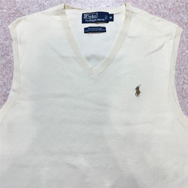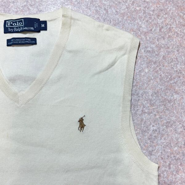 「Polo by Ralph Lauren (ポロラルフローレン)」90s 00s 10s Mサイズ ピマコットン オフホワイト ポニー刺繍 ニット ベスト [2516080]