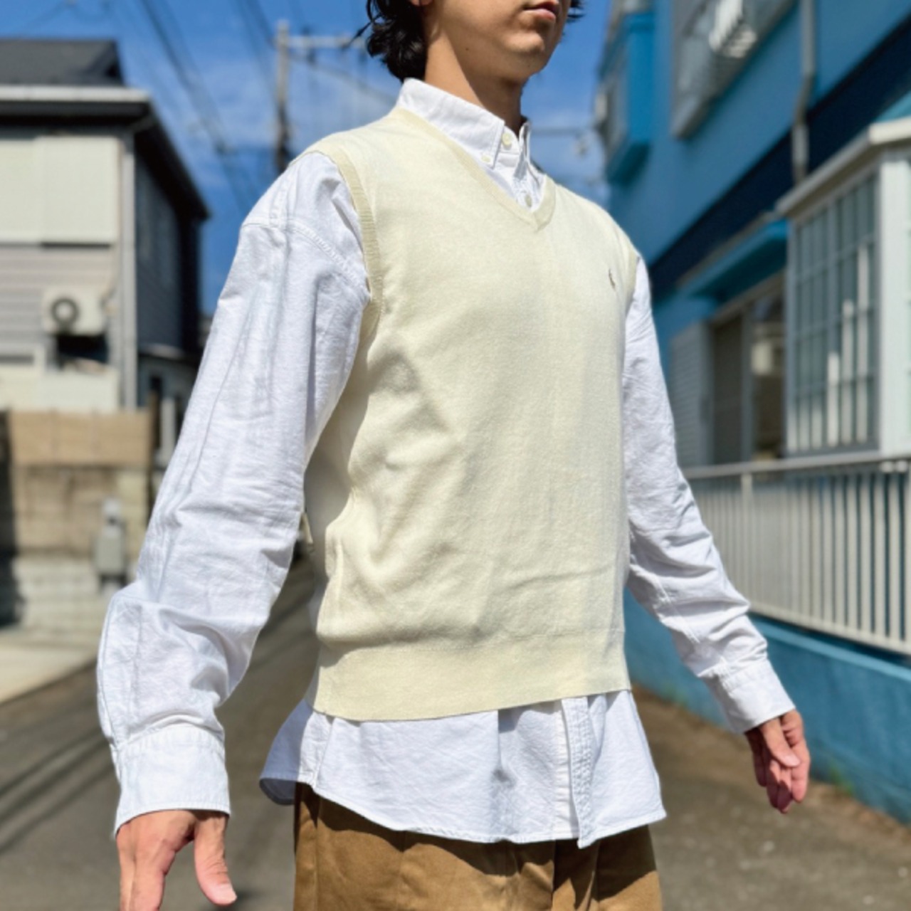 ニットベストに相性抜群な襟付きシャツはもちろん、カットソーを合わせていただいても、様になる着こなしをお楽しみいただけます!