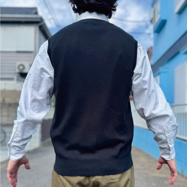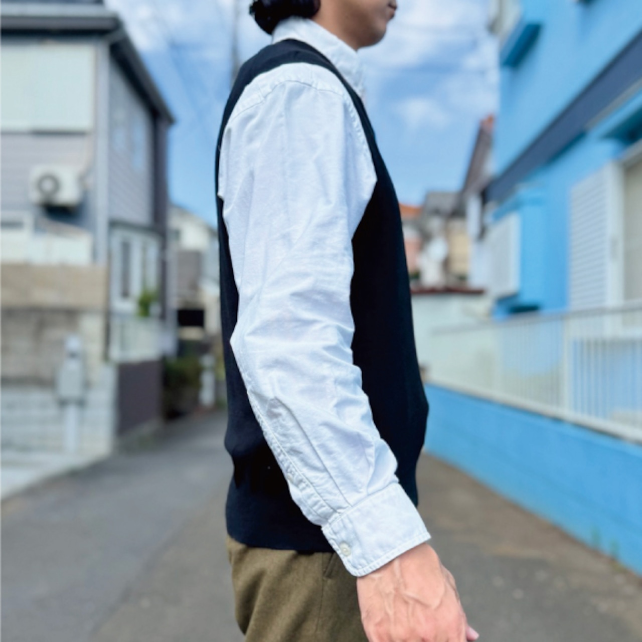 ニットベストに相性抜群な襟付きシャツはもちろん、カットソーを合わせていただいても、様になる着こなしをお楽しみいただけます!