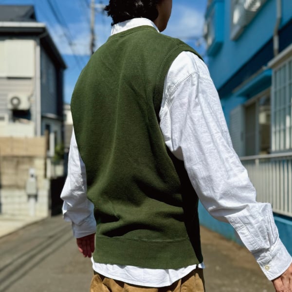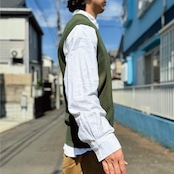 ニットベストに相性抜群な襟付きシャツはもちろん、カットソーを合わせていただいても、様になる着こなしをお楽しみいただけます!
