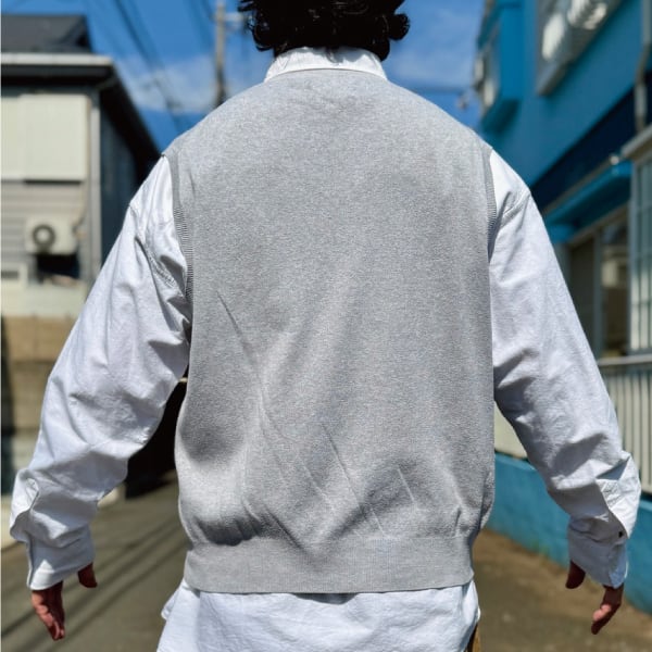 ニットベストに相性抜群な襟付きシャツはもちろん、カットソーやトレーナー、パーカーなどを合わせていただいても、様になる着こなしをお楽しみいただけます!