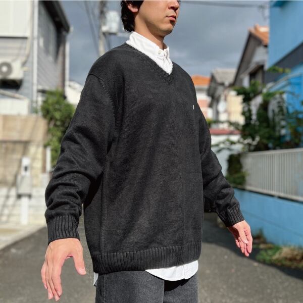 「LACOSTE(ラコステ)」90s 6サイズ ブラック コットン Vネック ニット セーター [2311027]