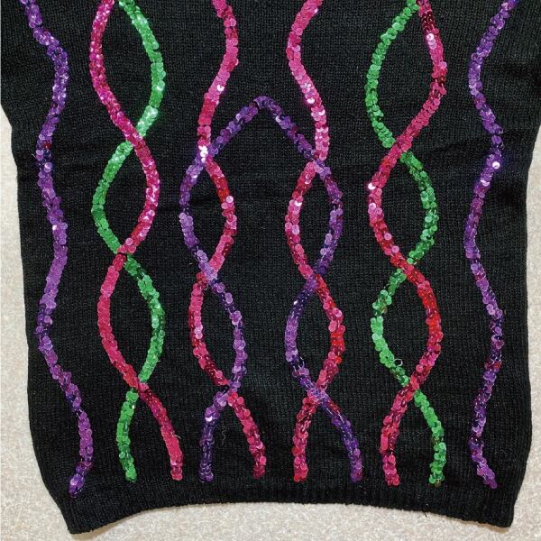 ボディ全体はスパンコールの3色をより際立てるブラックなので、パンツやアウターとの色合わせは容易!