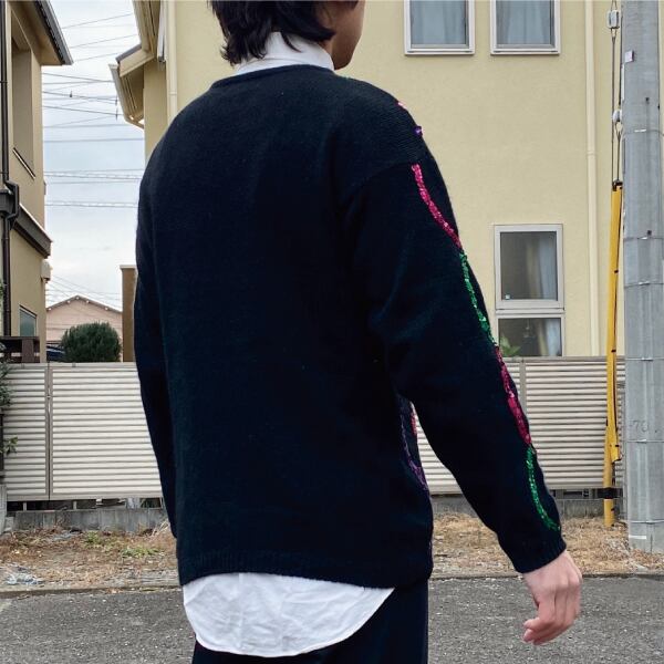 メンズにはなかなか馴染みのない装飾、「スパンコール」をあしらった良い意味でクセのあるセーターがシェリダンスクエアから入荷致しました!